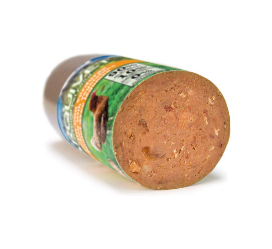 Wet food, in the form of a sausage, with 90% meat, grain-free and gluten-free. Indicated for all dogs from 3 months of age of all breeds and all sizes.