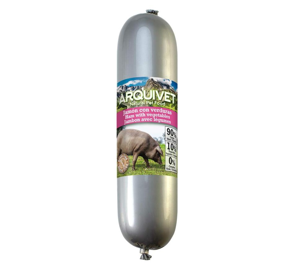 Arquivet Wet Dog Food in Ham Sausage with Vegetables. A highly palatable complete food for all types of dogs, providing energy and promoting a healthy metabolism. 90% meat and fish. Grain- and gluten-free.