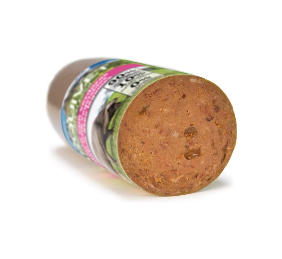 Wet, sausage-shaped food made from 90% meat and meat products (15% ham), grain-free and gluten-free. With ham and vegetables, it's suitable for all dogs of all breeds and sizes from 3 months of age.