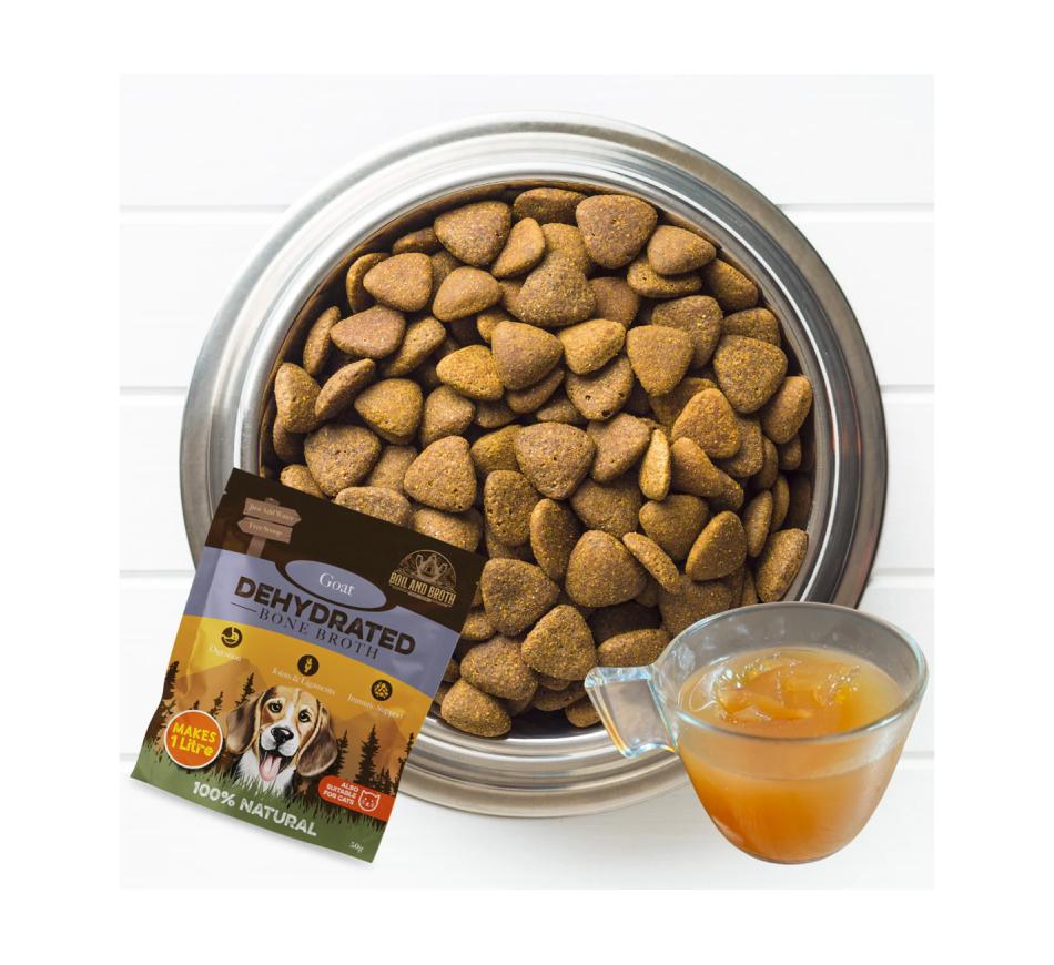 Dehydrated goat meat broth for dogs and cats. An excellent complementary food, it is beneficial for intestinal health, skin, coat, nails, joints, ligaments, and the overall well-being of your pet.