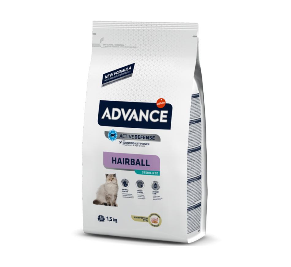 Advance Cat Sterilized Hairball ayuda a controlar el peso en gatos esterilizados, reduce el riesgo de problemas urinarios, y gracias a la fibra de avena y extracto de malta ayuda a prevenir la formación de bolas de pelo, todo en un solo pienso.