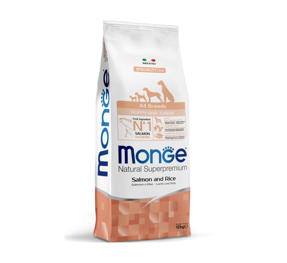 Monge Natural Superpremium Specialty Line Puppy & Junior con Salmón y Arroz es un alimento completo, monoproteico, una sola proteína, salmón, apto para cachorros, hasta 1 año de edad, de todas las razas.