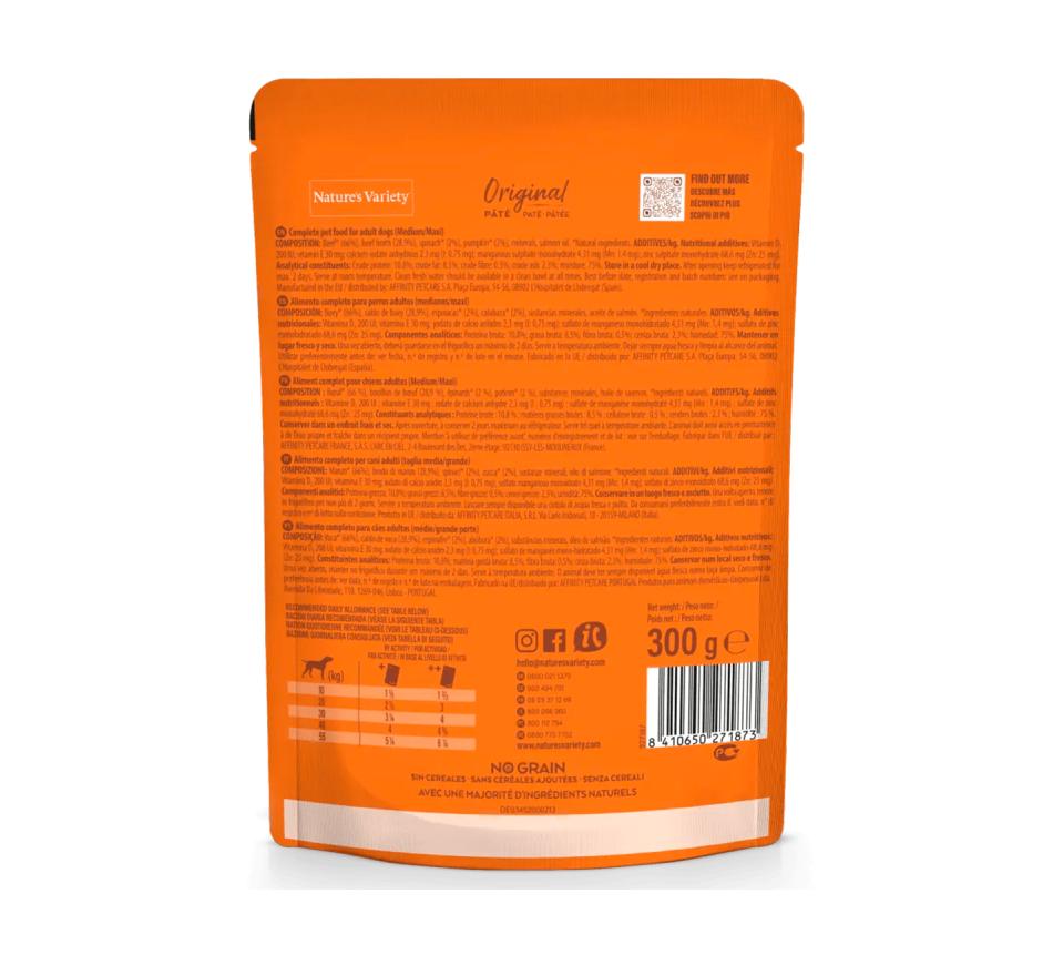 Alimento completo, en paté, equilibrado para perros adultos, sin cereales. Con carne de vacuno de primera calidad como ingrediente principal, y con frutas y verduras.