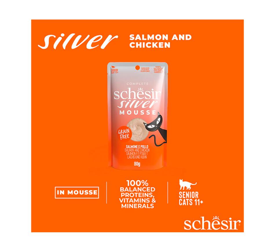 Una receta formulada específicamente para gatos a partir de 11 años, repleta de proteínas de salmón y pollo, mezcladas en una suave mousse.