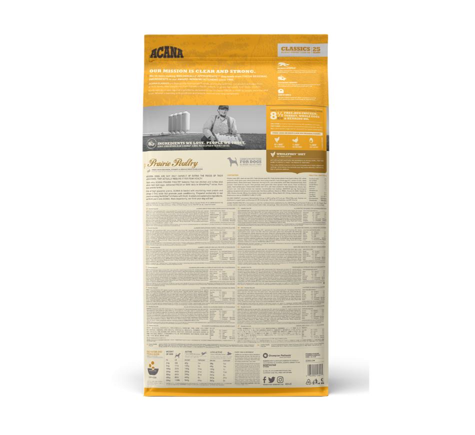 Acana Prairie Poultry inclui frango e peru criados ao ar livre e ovos de capoeira, entregues frescos ou crus diariamente em rácios Wholeprey™, a partir de quintas locais. Isento de grãos com elevado índice glicémico, os alimentos Acana estão repletos de proteína de carne nutritiva e ácidos gordos ómega 3 que promovem as condições físicas ideais.