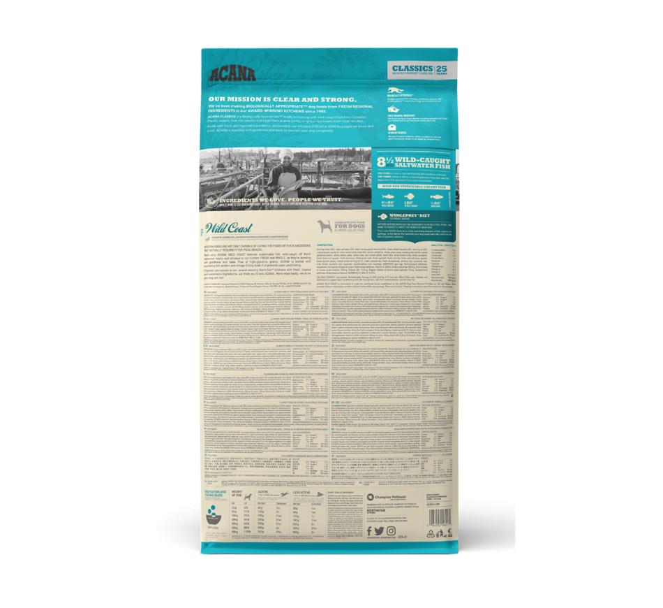 Acana Classics Wild Coast inclui peixe selvagem capturado de forma sustentável, ao largo da ilha de Vancouver Norte e levado fresco e inteiro para as nossas cozinhas, por isso, está repleto de benefícios nutricionais e de sabor. Isento de grãos com elevado índice glicémico, Acana está repleto de proteína de peixe nutritiva e ácidos gordos ómega 3 que promovem as condições físicas ideais.