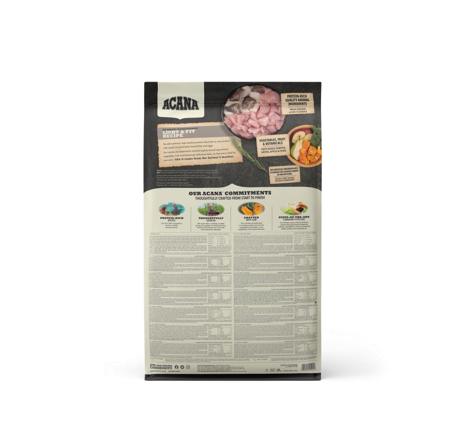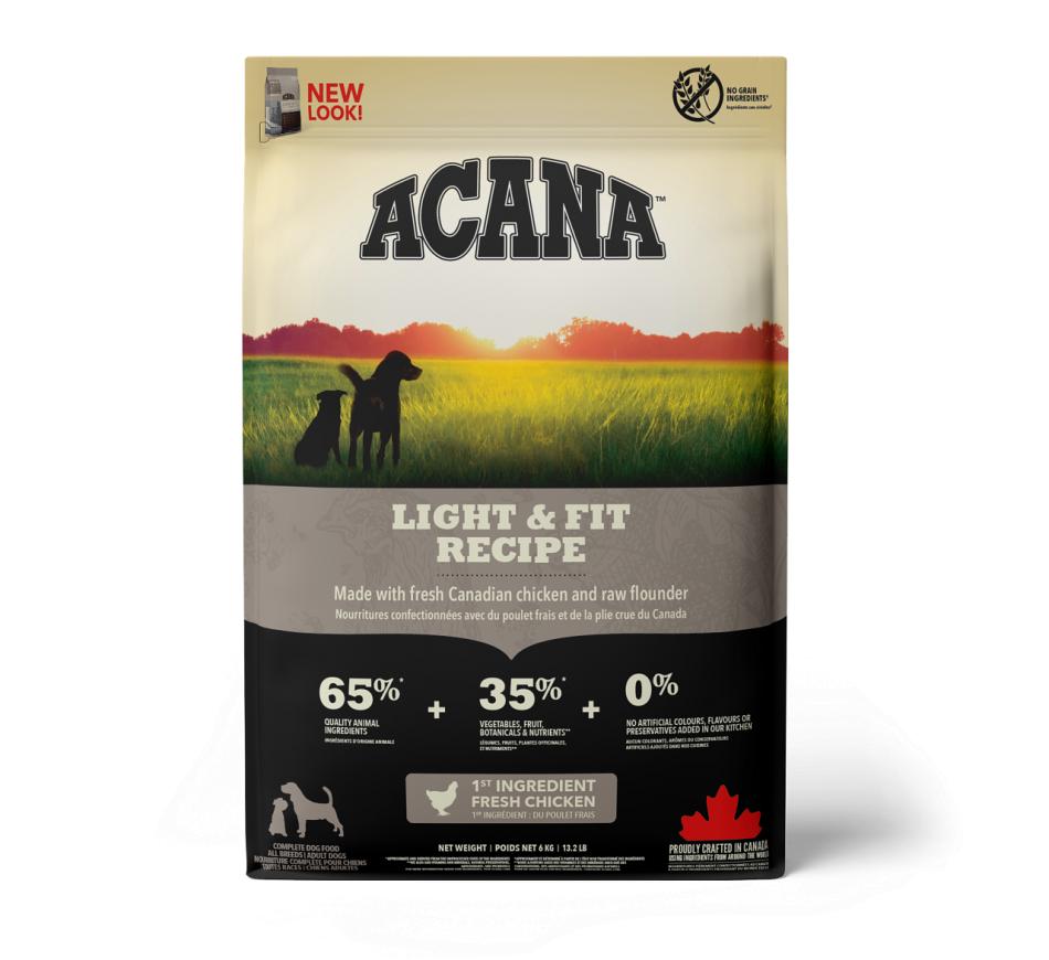 Acana Light & Fit está indicado para todos os cães adultos a partir de 1 ano e está repleto de ingredientes locais frescos, incluindo frango criado ao ar livre, ovos de capoeira, linguado selvagem e fruta e vegetais amadurecidos ao sol.