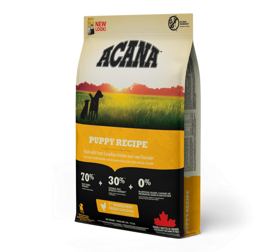Acana Puppy Recipe está indicado para cachorros cujo peso em adulto esteja entre os 9kg e os 25kg e é repleto de frango criado ao ar livre, ovos de capoeira, linguado selvagem e fruta e vegetais amadurecidos ao sol.