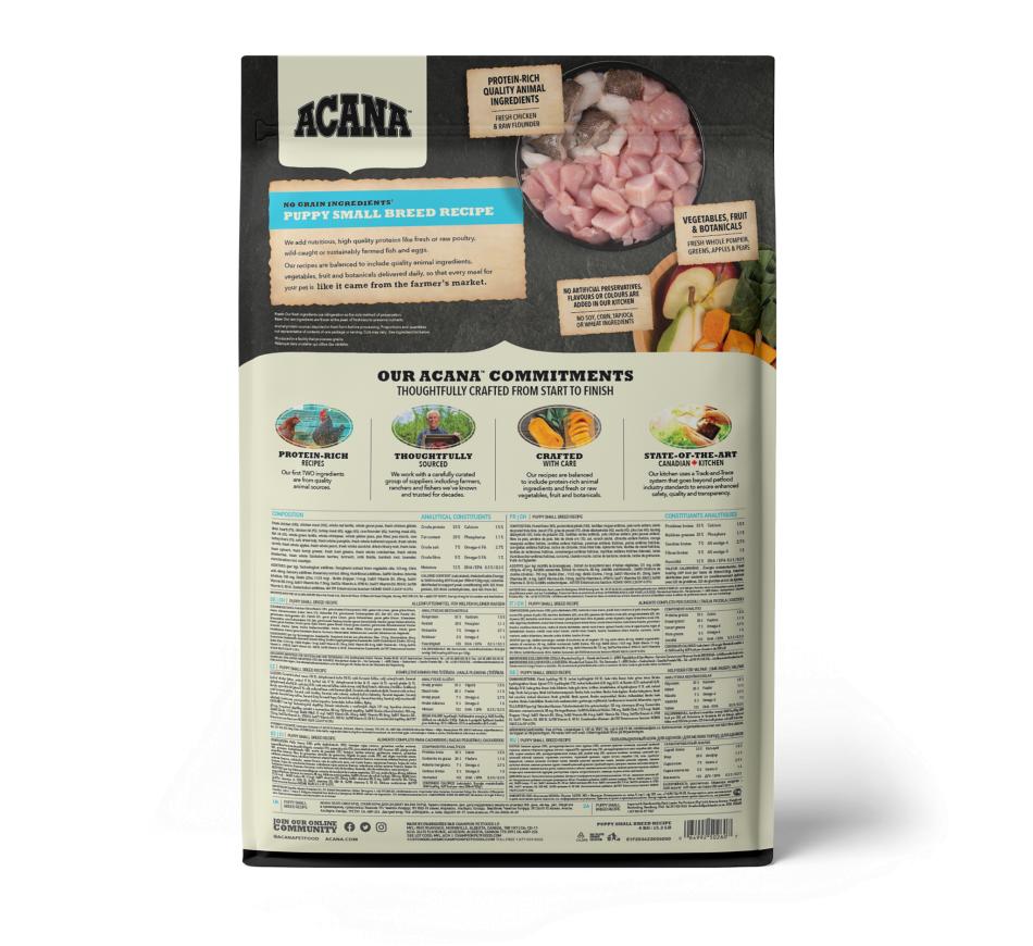 Preparado nas nossas cozinhas premiadas no Canadá, Acana Puppy Small Breed está repleto de frango criado ao ar livre, ovos de capoeira, linguado selvagem e fruta e vegetais amadurecidos ao sol. Produtos regionais e frescos de elevada qualidade para manter o seu cachorro feliz, saudável e forte. Veja os nossos ingredientes, achamos que irá concordar connosco.