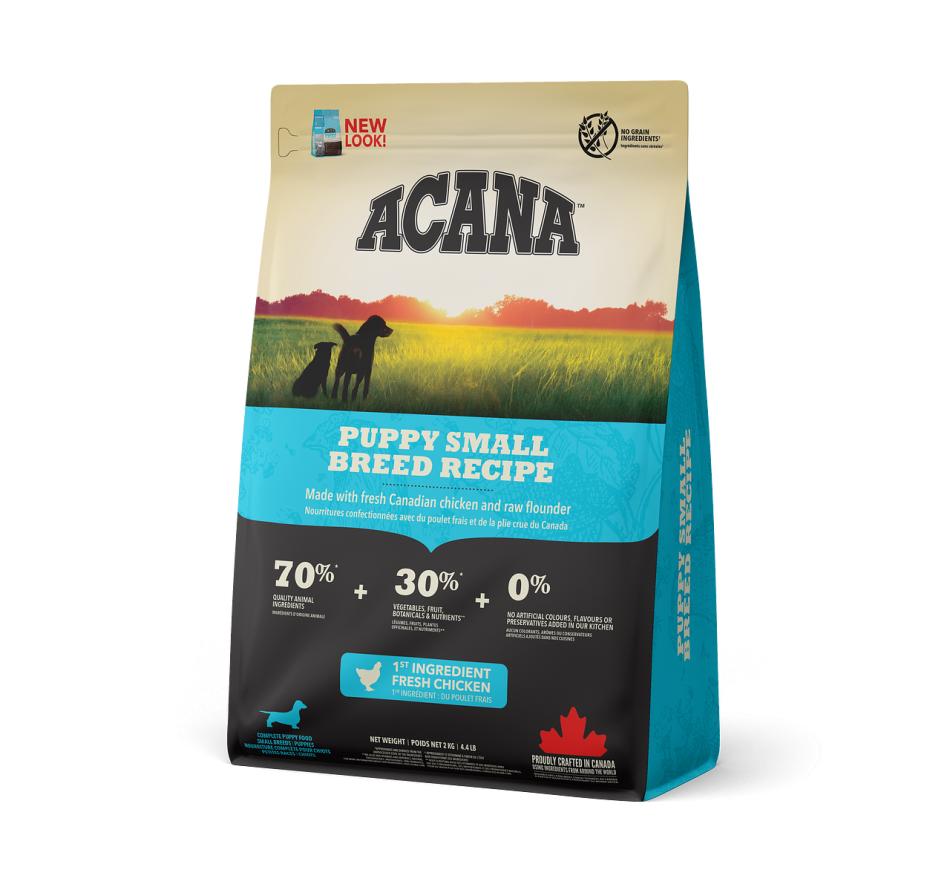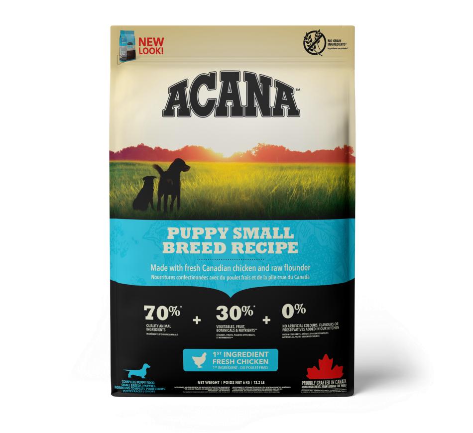 Acana Puppy Small Breed é indicado para cachorros cujo peso em adulto não ultrapasse os 9kg e está repleto de frango criado ao ar livre, ovos de capoeira, linguado selvagem e fruta e vegetais amadurecidos ao sol.