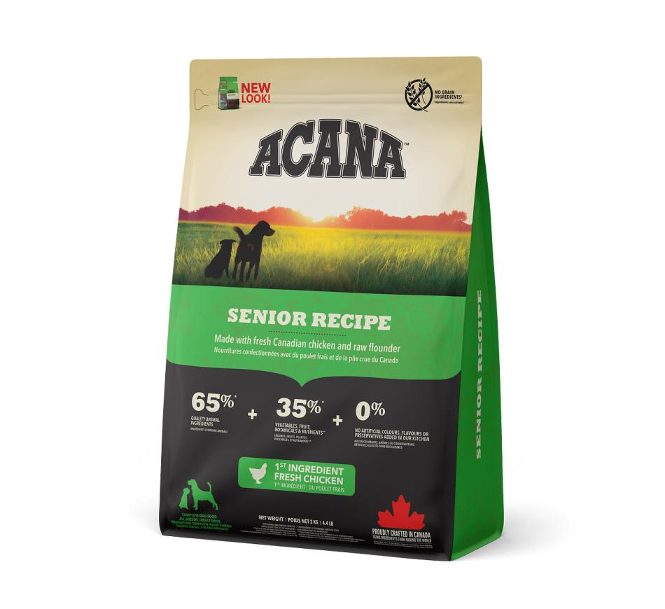 Acana Adult Senior está indicado para todos os cães adultos a partir dos 7 anos e está repleto de ingredientes locais frescos, incluindo frango criado ao ar livre, ovos de capoeira, linguado selvagem e fruta e vegetais amadurecidos ao sol.