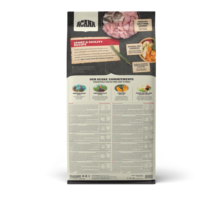 Preparado nas nossas premiadas cozinhas no Canadá, Acana Sport & Agility está repleto de ingredientes locais frescos, incluindo frango criado ao ar livre, ovos de capoeira, linguado selvagem e fruta e vegetais amadurecidos ao sol. Produtos regionais e frescos, cheios de coisas boas que promovem as melhores condições para todos os cães ativos.