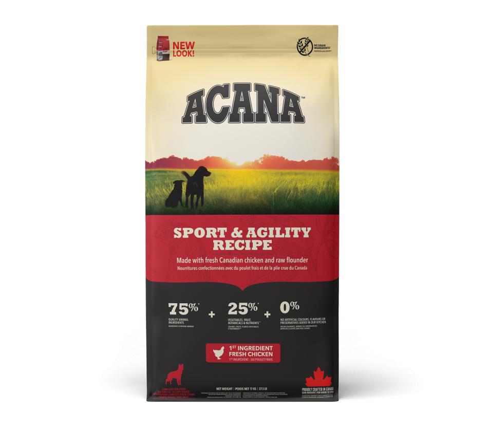Acana Sport & Agility é indicado para cães ativos e está repleto de ingredientes locais frescos, incluindo frango criado ao ar livre, ovos de capoeira, linguado selvagem e fruta e vegetais amadurecidos ao sol.