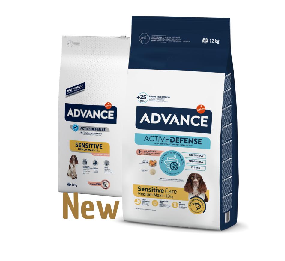 Advance Adult Sensitive Salmon & Rice é um alimento de alta gama especialmente indicado para cães de raça média e grande com intolerância à proteína da carne e a outros ingredientes frequentemente associados à sensibilidade digestiva: