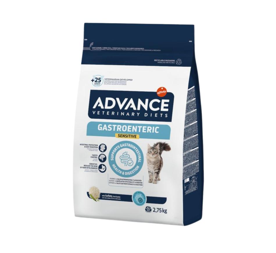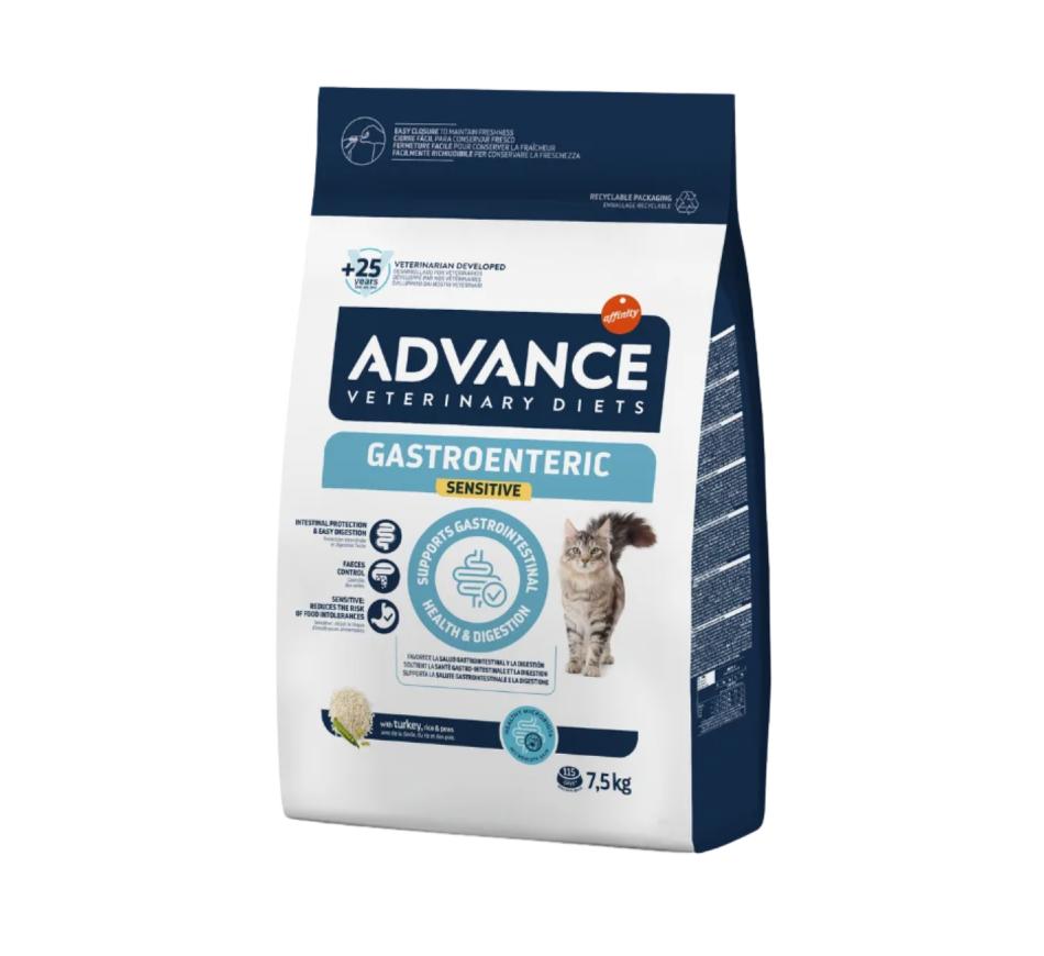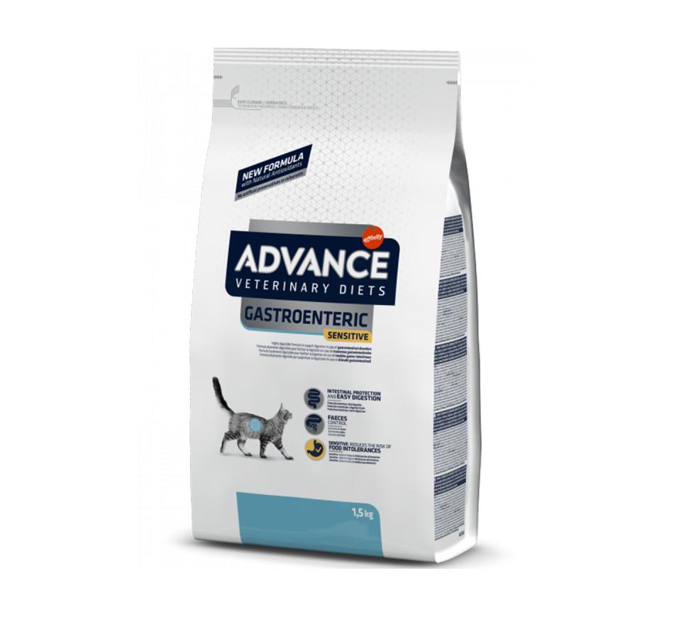 Advance Veterinary Diets Gastroenteric Sensitive é um alimento dietético completo para gatinhos a partir das 8 semanas e para gatos adultos, que ajuda a compensar as alterações da digestão em caso de transtornos gastrointestinais e de insuficiência pancreática exócrina.