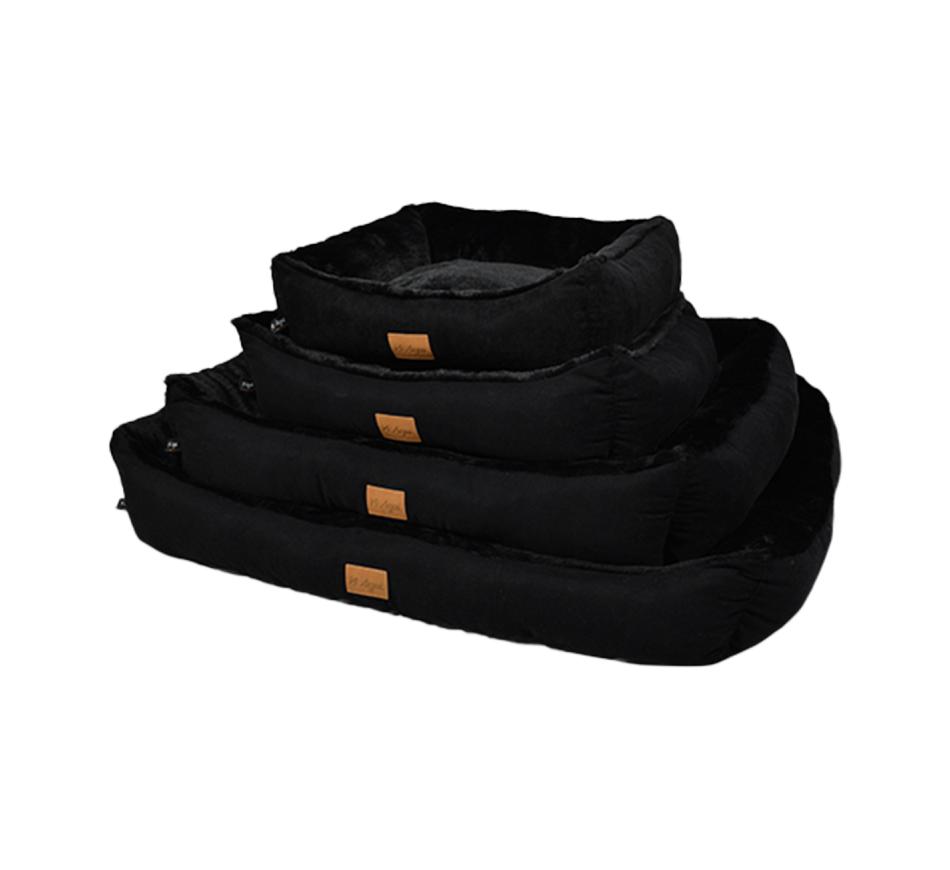 Cama em tom preto, produzida em tecido macio com logotipo em couro. Almofada interna e laterais forradas em pele macia. Enchimento interior em fibra reciclada.