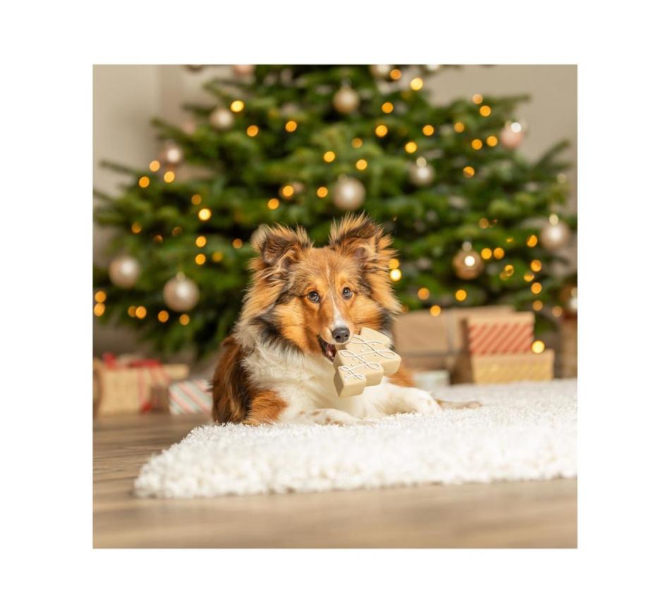 Brinquedo festivo para cães em forma de árvore de Natal. Feito de látex durável e leve e silencioso.