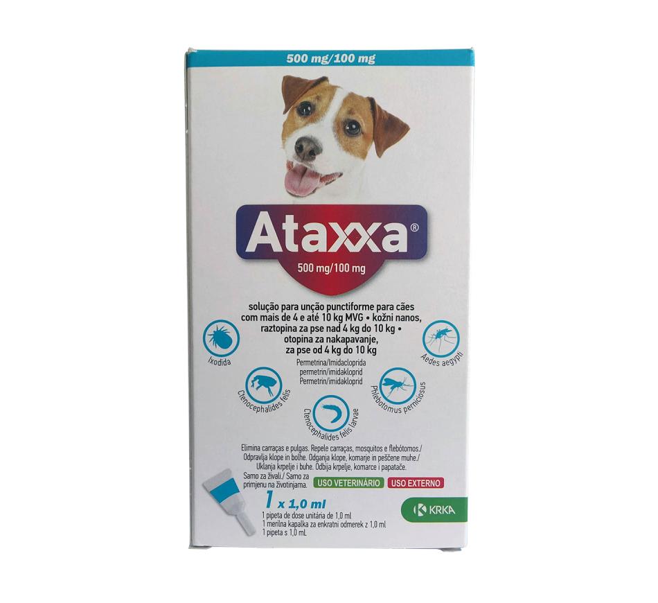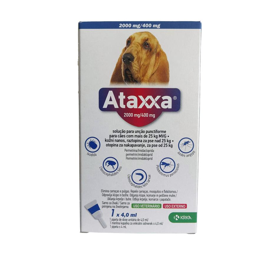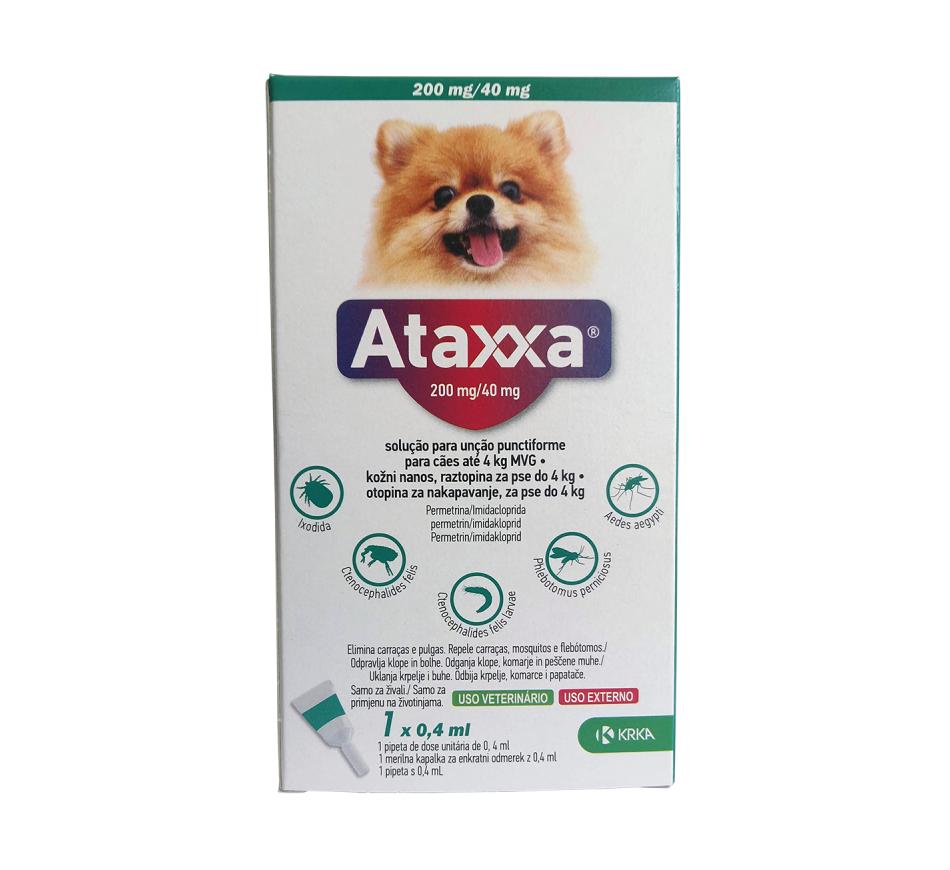 Ataxxa é um ectoparasiticida de uso tópico contendo imidacloprida e permetrina. Ataxxa Spot-on para o controlo de parasitas externos em cães Pipeta ergonómica, facilmente diferenciavel pela cor.