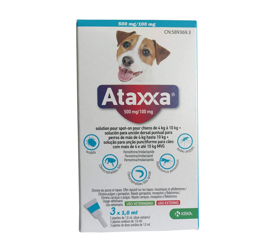 Ataxxa é um ectoparasiticida de uso tópico contendo imidacloprida e permetrina. Ataxxa Spot-on para o controlo de parasitas externos em cães Pipeta ergonómica, facilmente diferenciavel pela cor.