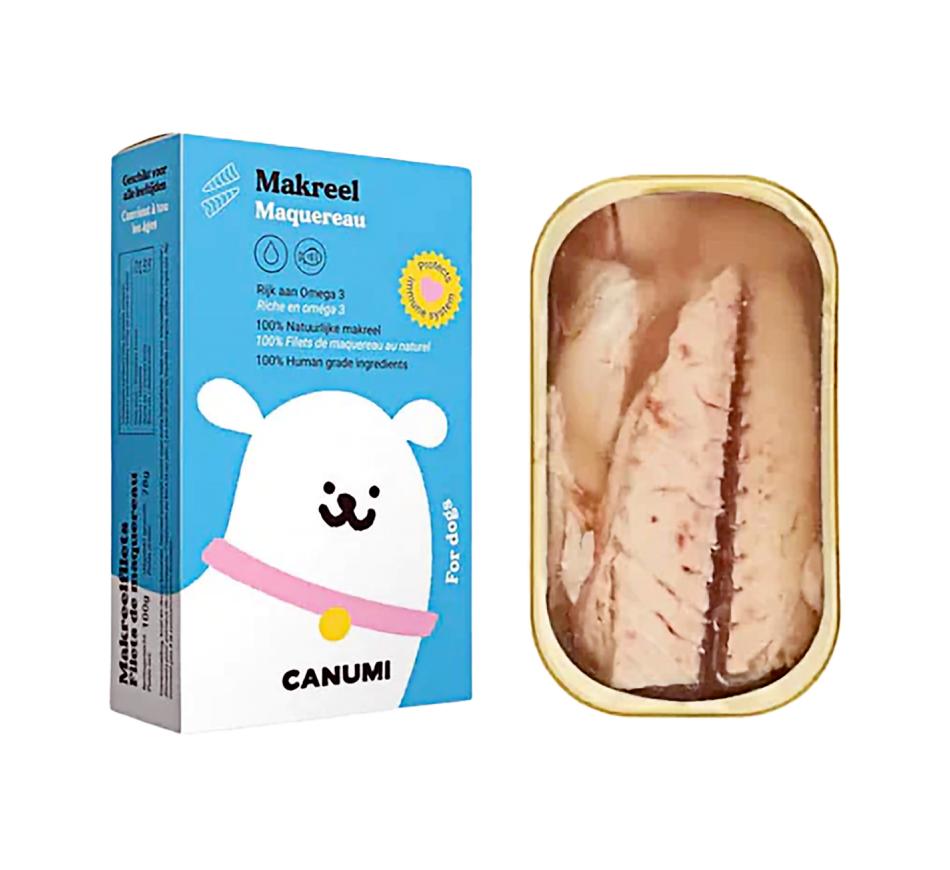 Canumi Cão Filete Cavala - Os filetes de cavala Canuni, sem sal e conservados em caldo de peixe, são uma refeição saudável e nutritiva para cães.