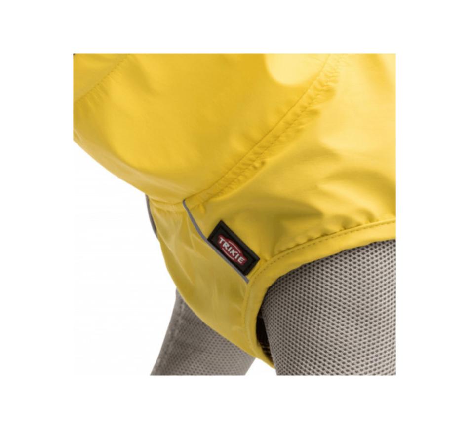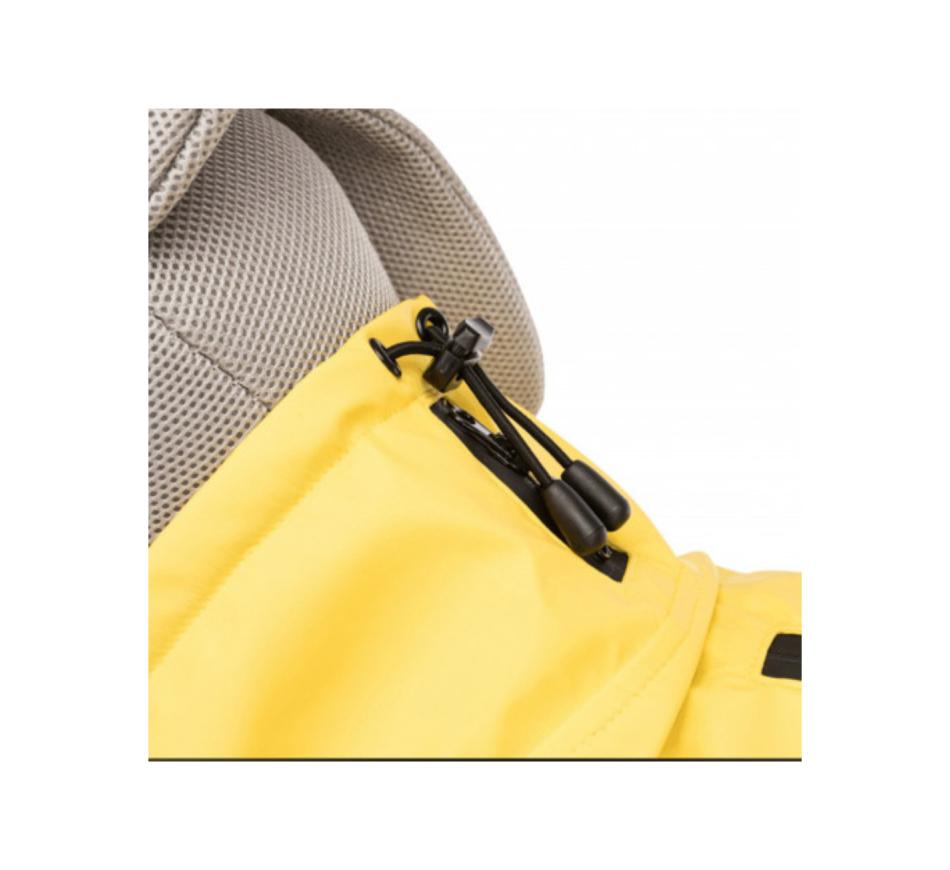 Capa de chuva Vimy Amarela para cães. Com dois fechos zip à prova de água, na área do pescoço para colocar uma trela e nas costas para usar com um peitoral. Gola extra-alta com ajuste no pescoço.