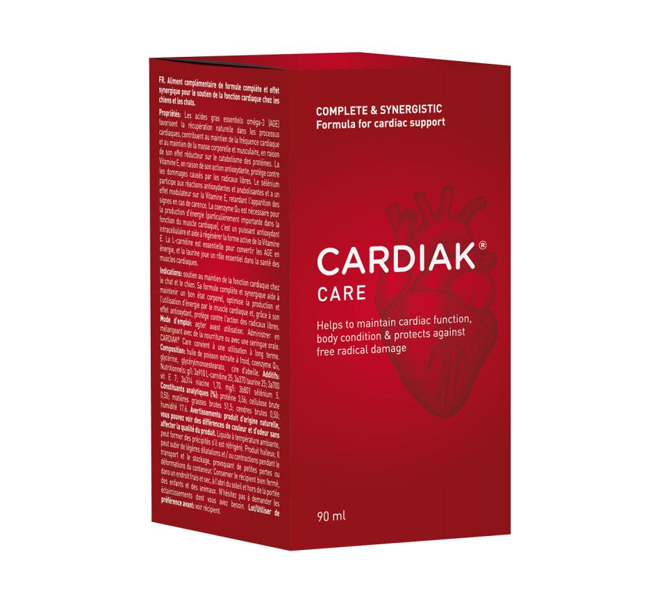 Cardiak está indicado no apoio na manutenção da função cardíaca em cães e gatos. A sua fórmula completa e com efeito sinergético ajuda a manter uma boa condição corporal, a otimizar a produção e o uso de energia do músculo cardíaco e, protege frente à ação dos radicais livres.