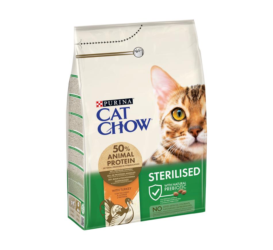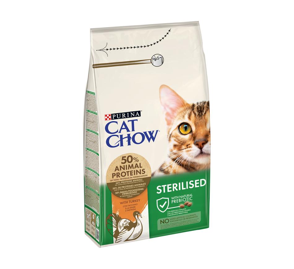 Cat Chow Sterilised Peru é um alimento completo para gatos adultos esterilizados com níveis adaptados de proteína e gordura, para ajudar a manter músculos fortes e um peso saudável.