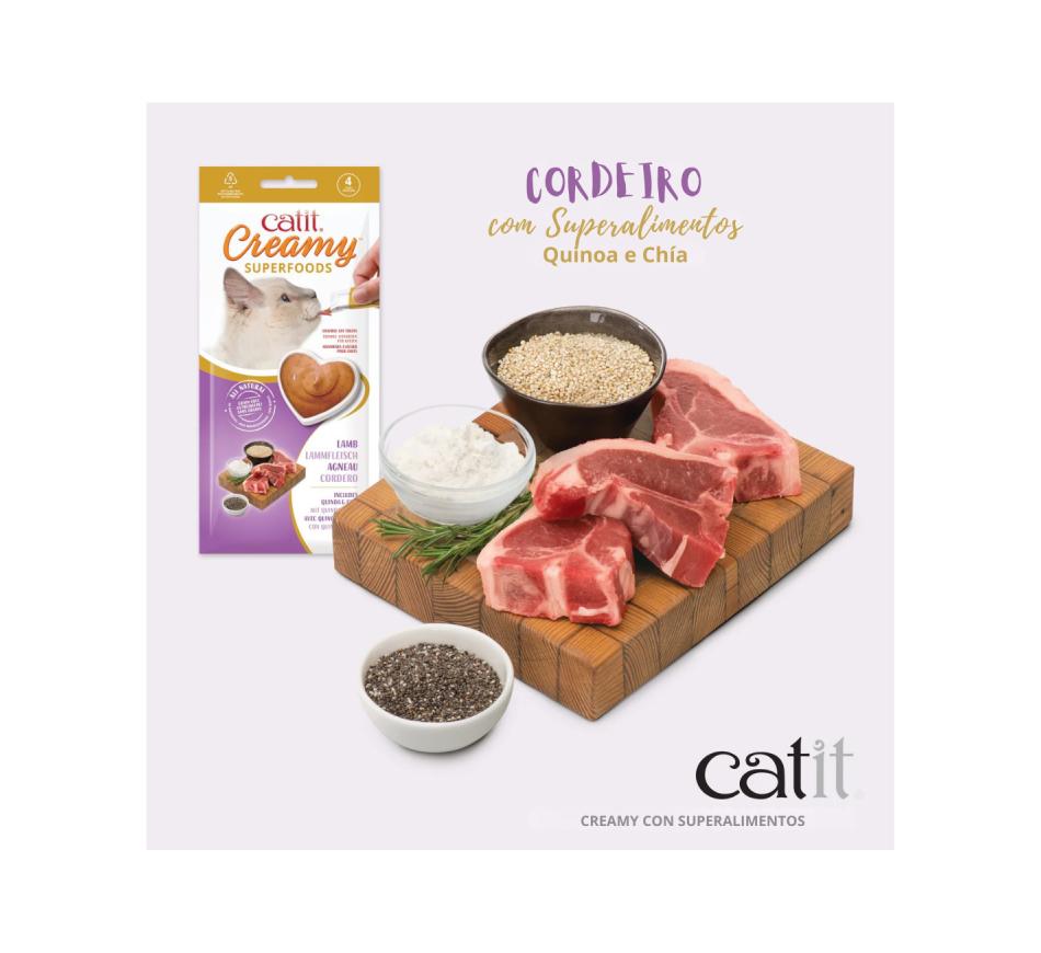 Catit Creamy Superfood Borrego com quinoa e chia é deliciosamente natural e inclui taurina essencial. Sem cereais, trigo, soja e não possuem subprodutos, conservantes, aditivos ou sabores artificiais. Embalados em convenientes porções individuais, os Catit Creamy Superalimentos são o snack hidratante perfeito para gatos de todas as idades.