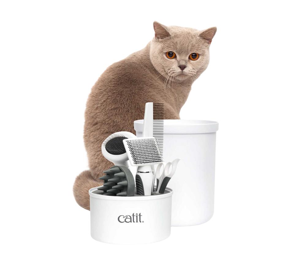 Os kits de preparação da Catit incluem todas as ferramentas que precisa para manter o pelo e as unhas do seu gato saudável e bonito.