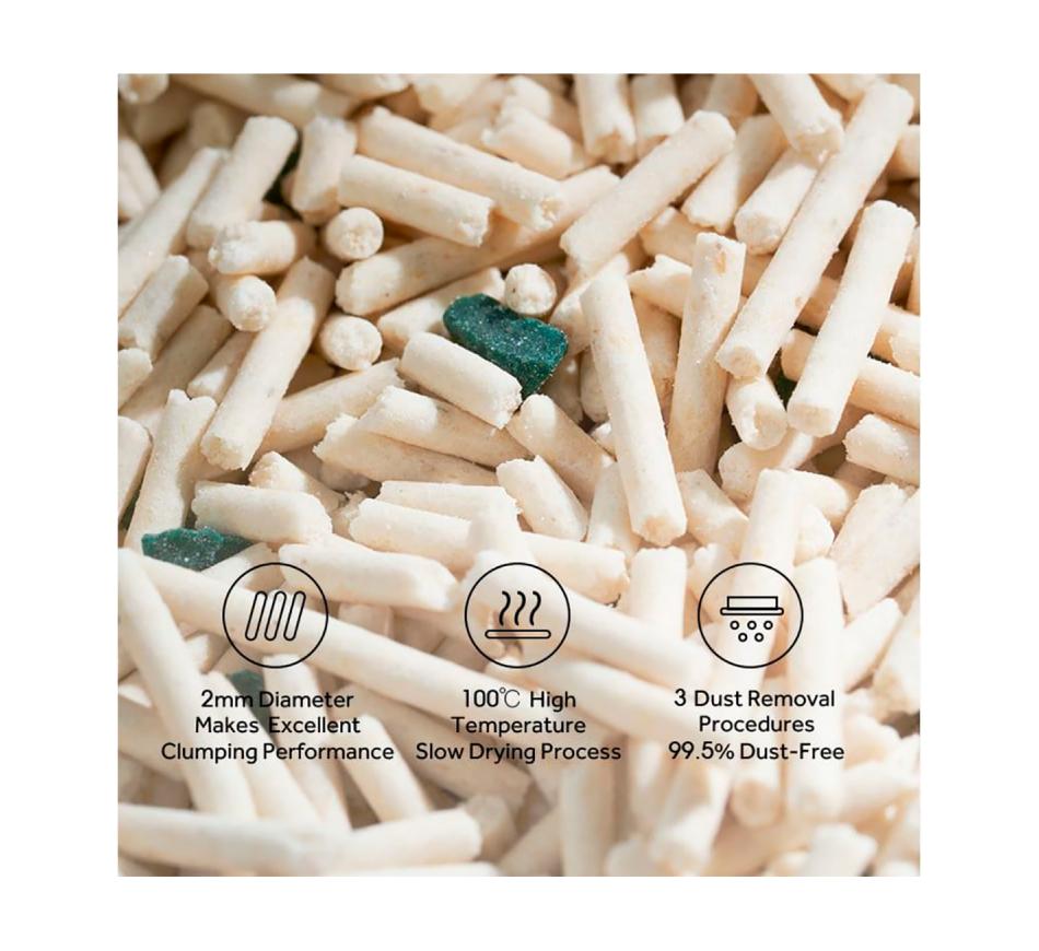 Areia super aglomerante com super controlo de odores, 95% tofu casca de ervilha + 5% zeolite, biodegradável e ecológica. 400% Taxa de absorção é ideal para ambientes com mais do que um gato.