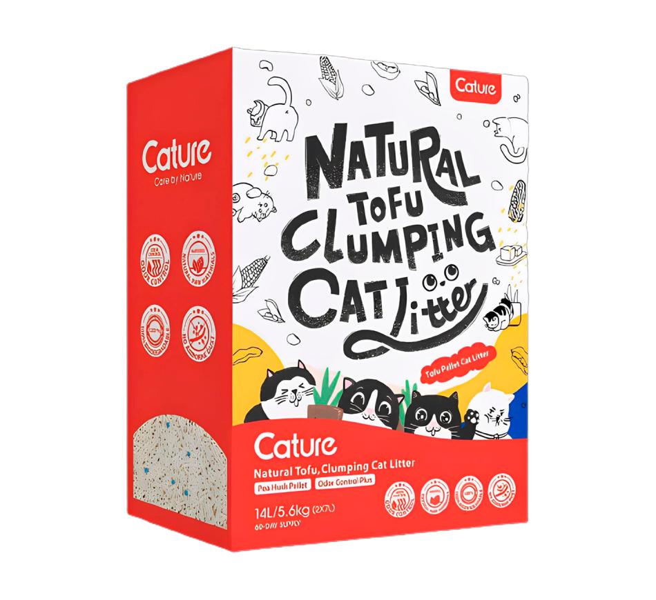 Cature® Premium Cat Litter Tofu, é um absorvente para higiene de gatos, inteiramente de origem vegetal à base de ervilha, 100% natural, biodegradável e isento de componentes químicos e seguro, mesmo se acidentalmente ingerido. As fibras vegetais de tofu retêm os líquidos criando uma bola compacta, facilmente removível e eliminável na sanita ou no lixo doméstico. Tem um poder de absorção muito grande e retém os maus odores. O tofu é leve e suave nas patas, 100% seguro e não tóxico para humanos ou animais, não risca o chão nem solta poeiras.