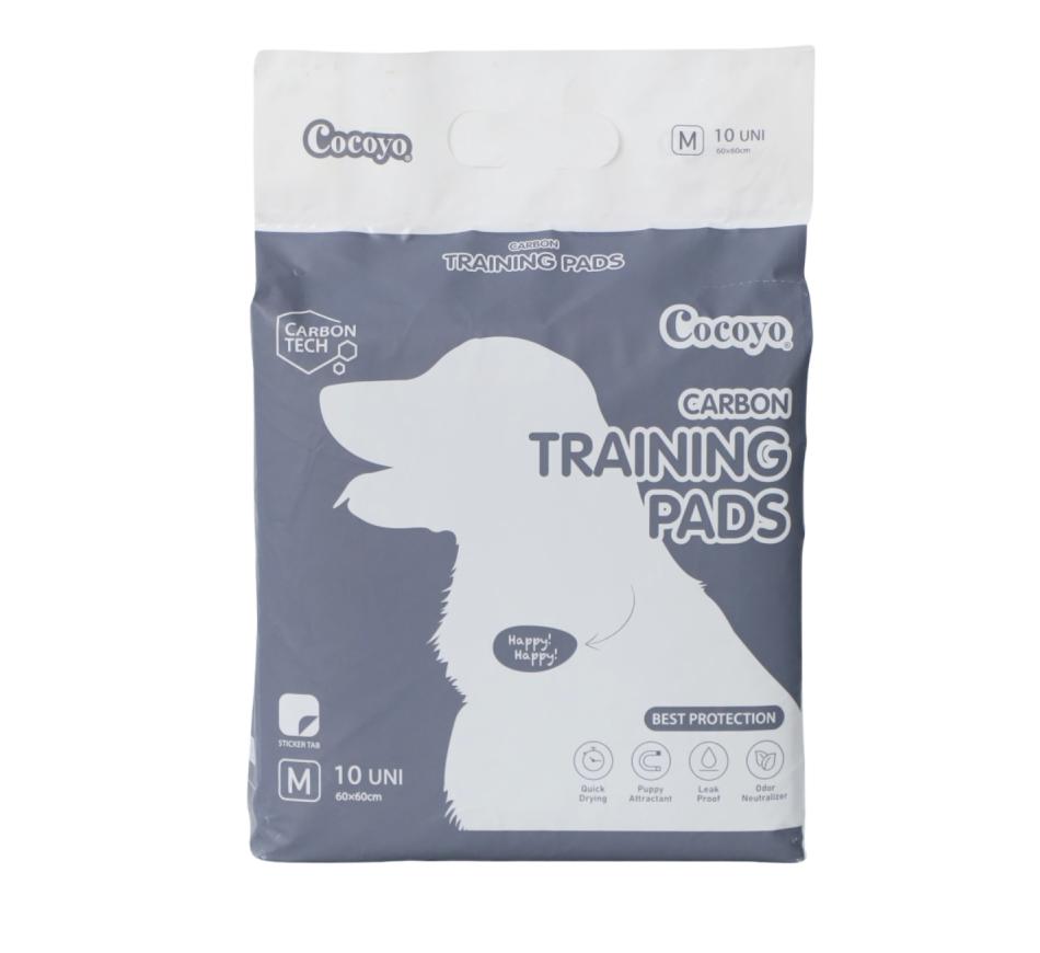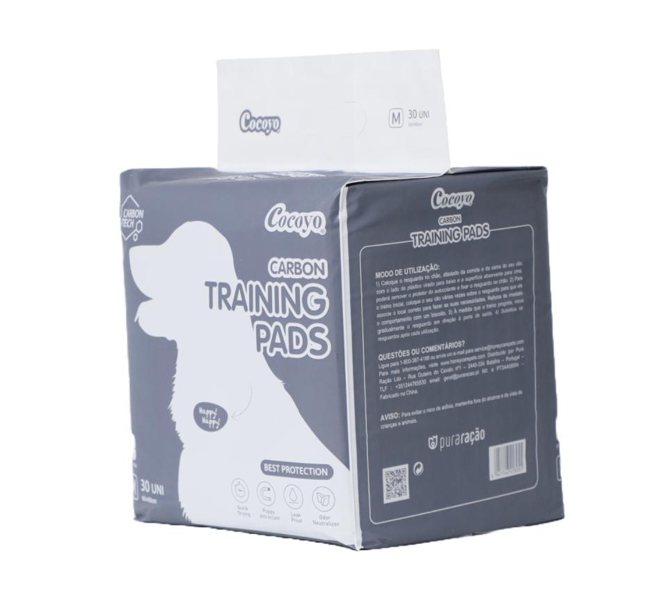 Cocoyo Resguardos Super Absorventes Carbon, são tapetes higiénicos de alta absorção para cães, com bordas reforçadas para evitar vazamentos e proteger o chão. A camada de polímero superabsorvente transforma os líquidos em gel, facilitando a limpeza e mantendo o ambiente seco e livre de odores, enquanto o carvão ativado garante um controle superior de odores.