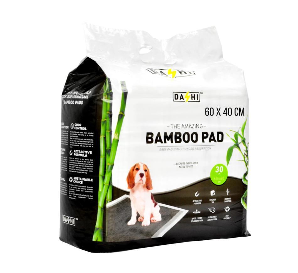 Dashi Resguardos Higiénicos Bamboo Com Carvão contém carvão de bambu superabsorvente e antibacteriano, neutraliza odores desagradáveis, não deixa manchas no chão e possui base adesiva para evitar que o cão o desloque de sítio.
