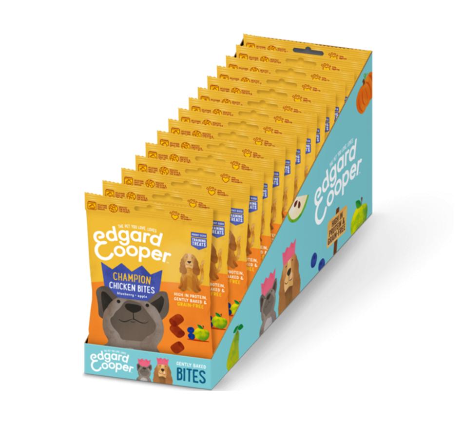 Os Bites Edgard & Cooper são ideais para recompensar o seu cão: autêntica carne fresca com frutas com um intenso sabor natural.
