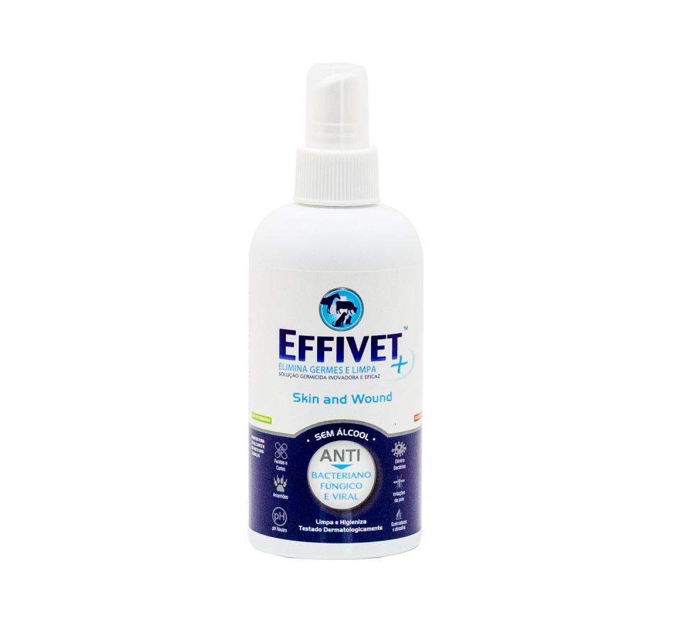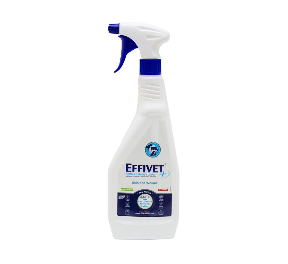 Effivet para a pele e feridas, adequado para várias espécies de animais, é um spray com ácido hipocloroso que aumenta o fluxo sanguíneo para a zona da ferida e elimina 99.9%das bactérias, vírus e fungos, reduzindo a inflamação e eliminando o odor
