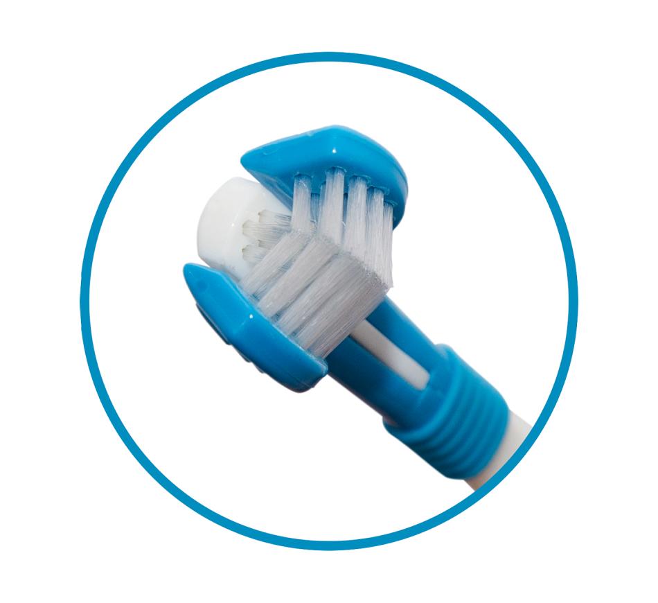 Escova de dentes formada por uma cabeça tripla flexível, confortável e eficaz, especialmente projetada para facilitar a limpeza de todos os cantos da boca.