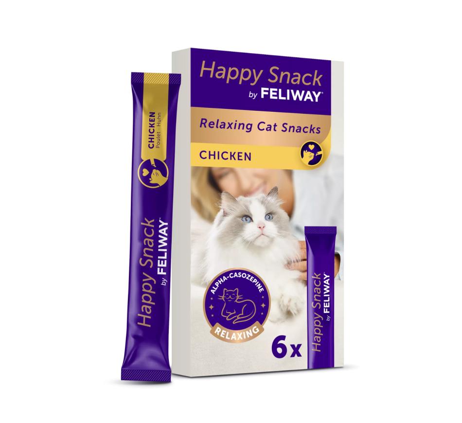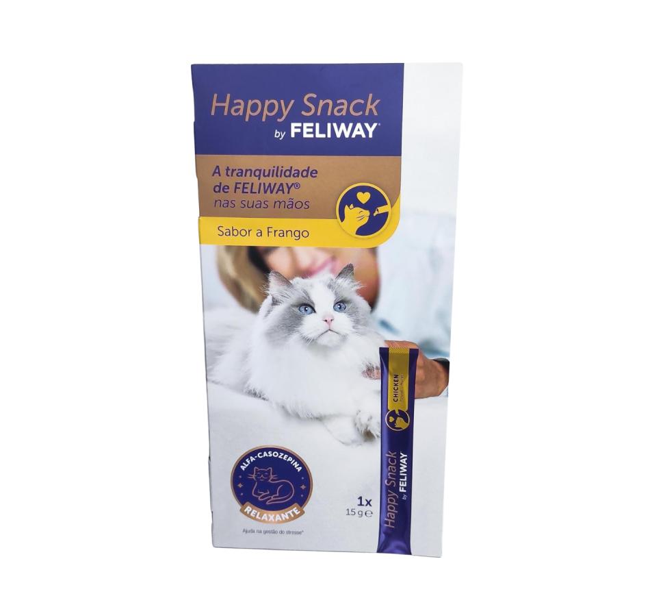 Happy Snack da FELIWAY – O novo e único petisco calmante para gatos, muito palatável, de fácil administração, com propriedades relaxantes com sabor a frango, baixo em calorias, pode ser dados diariamente. Sem adição de açúcar nem conservantes e corantes artificiais.