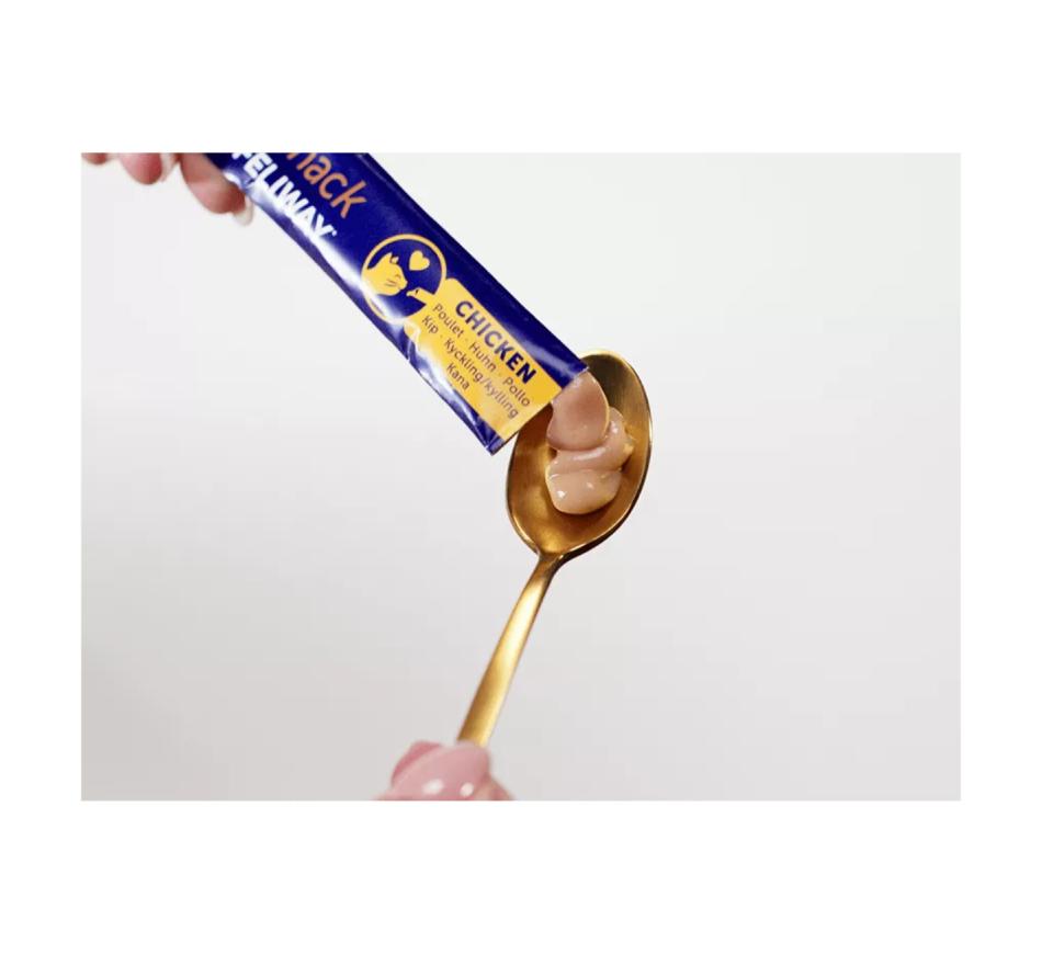 Alimento complementar em um snack leve e cremoso em uma guloseima lambível que os gatos vão adorar. Com sabor a frango, baixo em calorias e com propriedades relaxantes