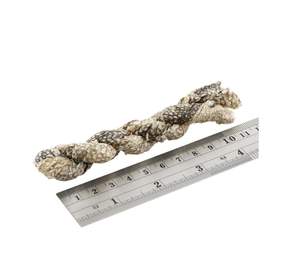Os Dental Sea Jerky Fish Twists têm 130 mm de comprimento por 25 mm de largura e 14 mm de profundidade (o tamanho pode variar ligeiramente).