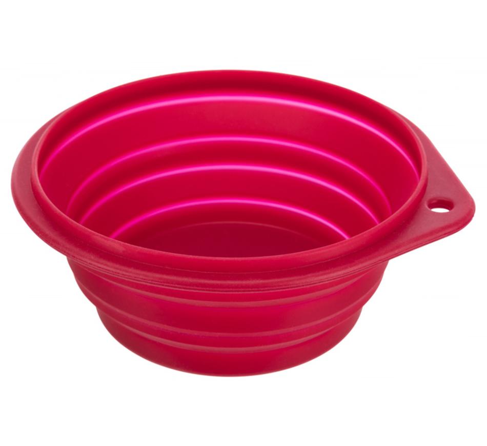 A Gamela viagem desdobrável serve de bebedouro e de comedouro, é feita a partir de silicone resistente e é desdobrável, encolhe ficando espalmada.