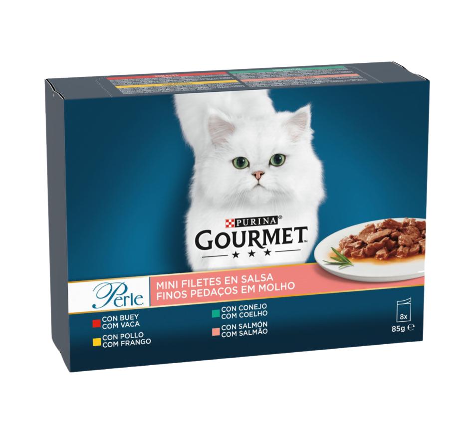 Delicie o seu gato em cada refeição com a nossa gama de alimento húmido para gatos GOURMET Perle finos pedaços em molho de Carne Vaca, Frango, Coelho, Salmão uma deliciosa variedade de finas e requintadas receitas.