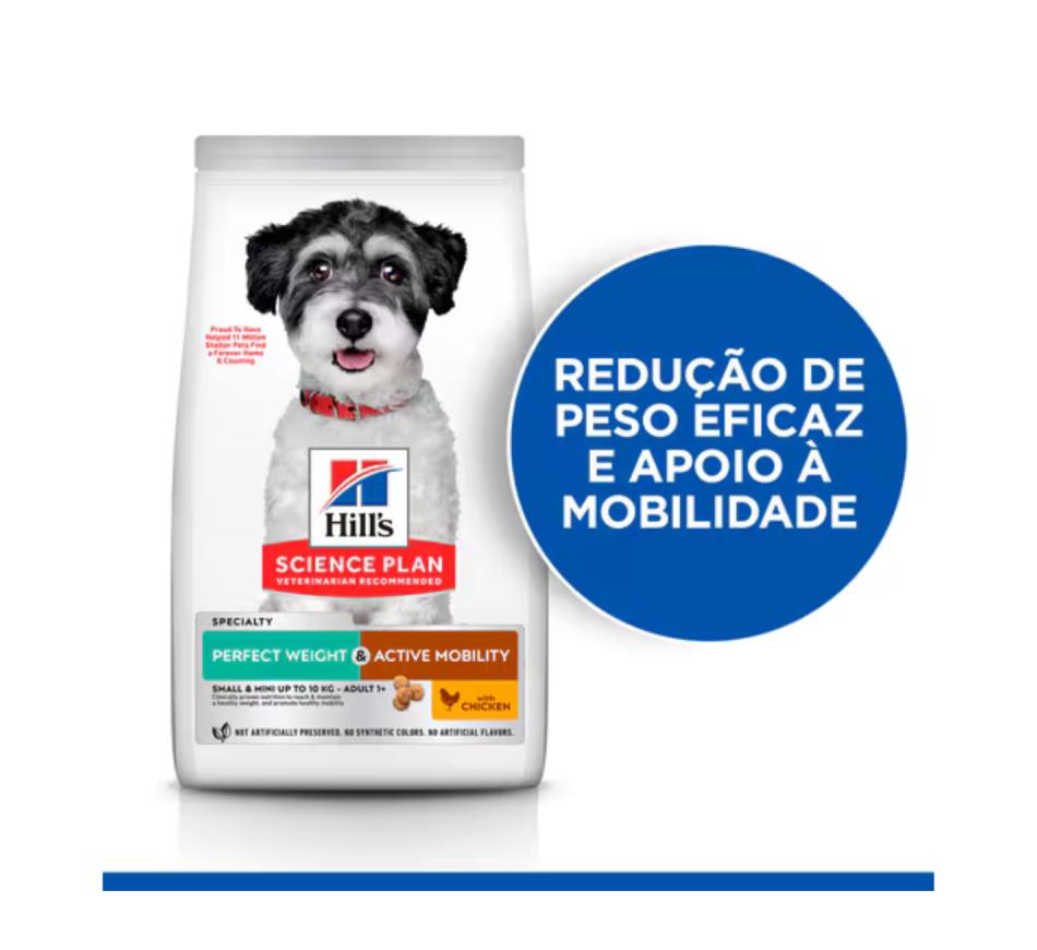 Hill's Science Plan Perfect Weight & Active Mobility alimento para cão adulto de raça pequena e mini com frango é um alimento completo para cães adultos de raça pequena com 1 ou mais anos de idade que têm predisposição para o aumento de peso ou estão ligeiramente acima do peso, um fator de risco para problemas de mobilidade.