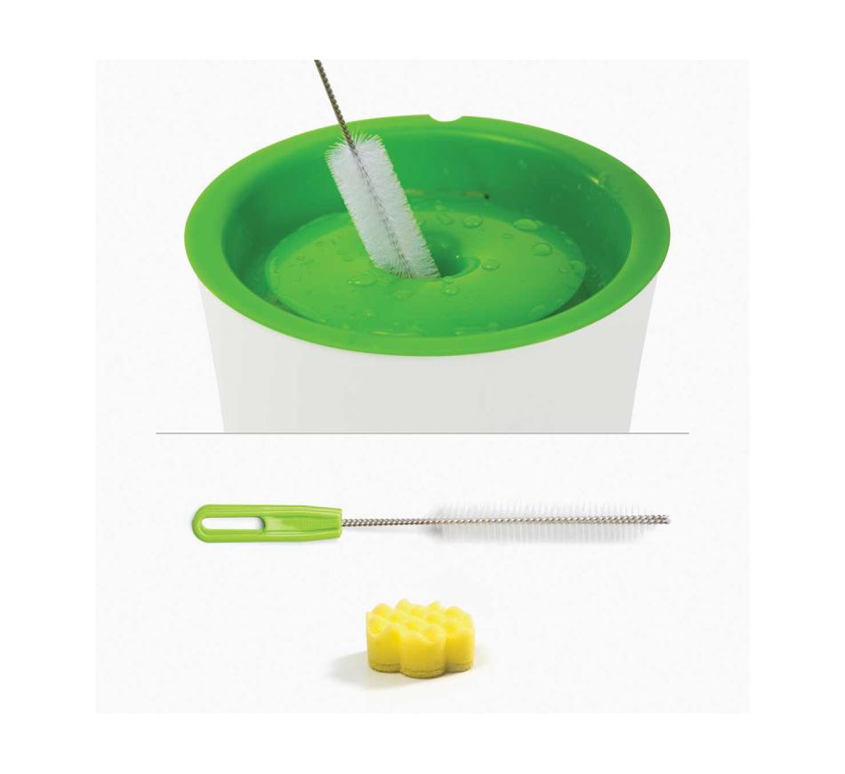 A maneira mais fácil de manter a fonte sempre limpa e sem sujidade é usando o kit de limpeza para bebedouros da Catit, que inclui uma escova de cerdas duras com uma ponta fina e uma esponja em forma de flor e duas texturas além de uma superfície ondulado, tudo o que você precisa para manter seu bebedouro limpo.