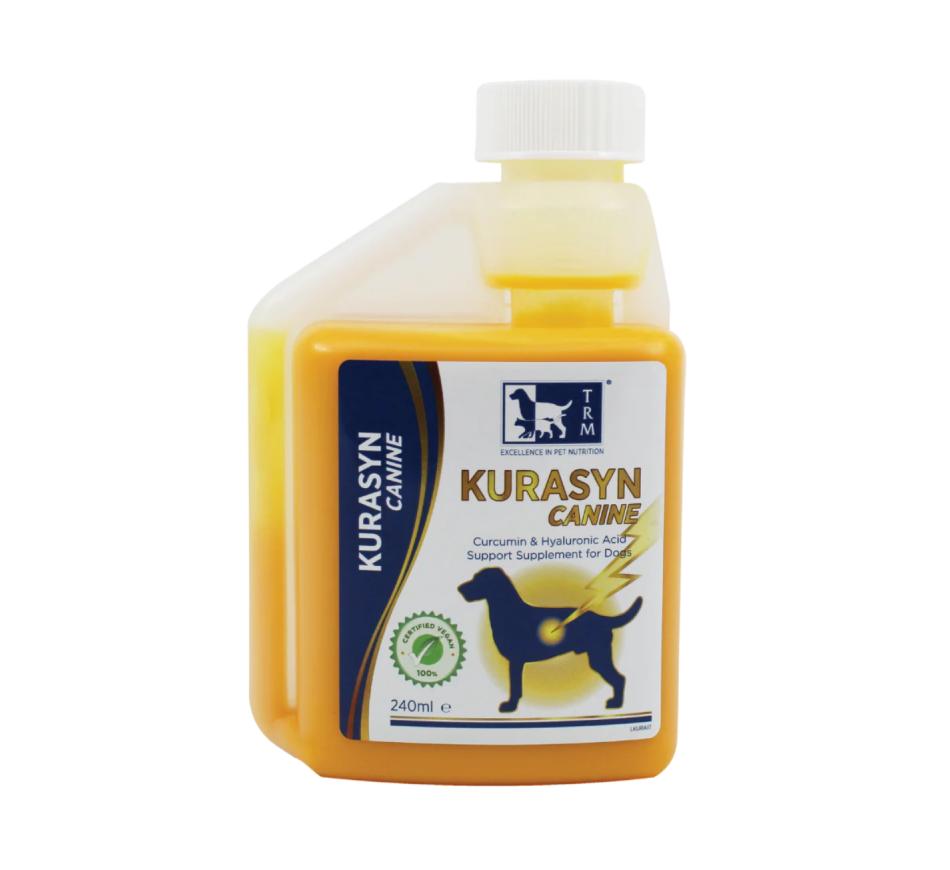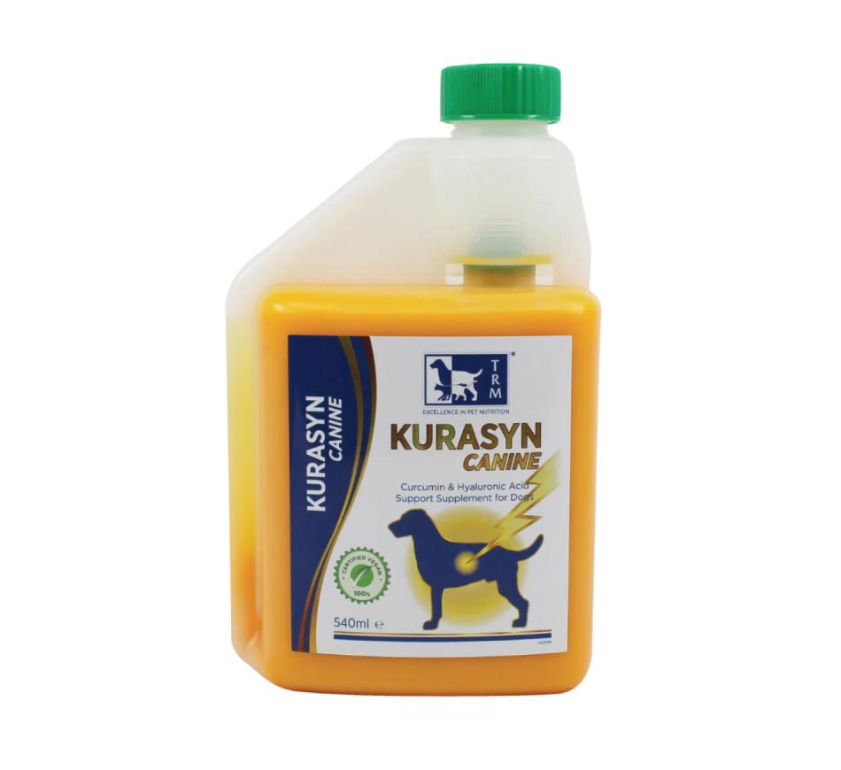 Kurasyn Canine é um suplemento alimentar complementar para cães que contém curcumina altamente biodisponível combinada com ácido hialurônico. A Cúrcuma (açafrão) utilizada na fórmula foi misturada com um oligossacarídeo natural e tem absorção significativamente melhor em comparação com a Cúrcuma(açafrão) sozinha.
