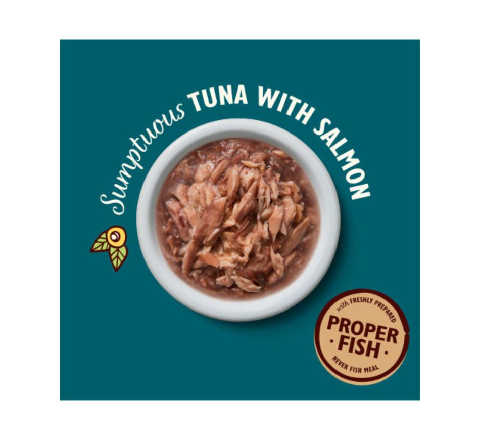 Alimento natural completo para gatos a partir dos 6 meses, filetes finos atum e salmão em um molho incrível, com vitaminas essenciais taurina e sem adição de cereais ou açúcar, feito a partir de ingredientes naturais.