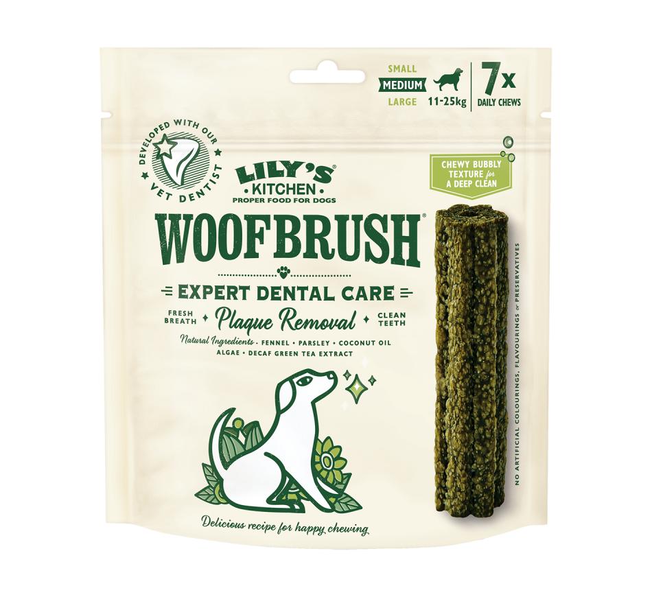 Lily's Kitchen Woofbrush Snack Dental Snack dental, de origem vegetal, para a limpeza diária dos dentes do seu cão Woofbrush é um snack dentário com uma diferença. Graças à sua textura esponjosa, o Woofbrush alcança a linha da gengiva para ajudar a remover a placa.