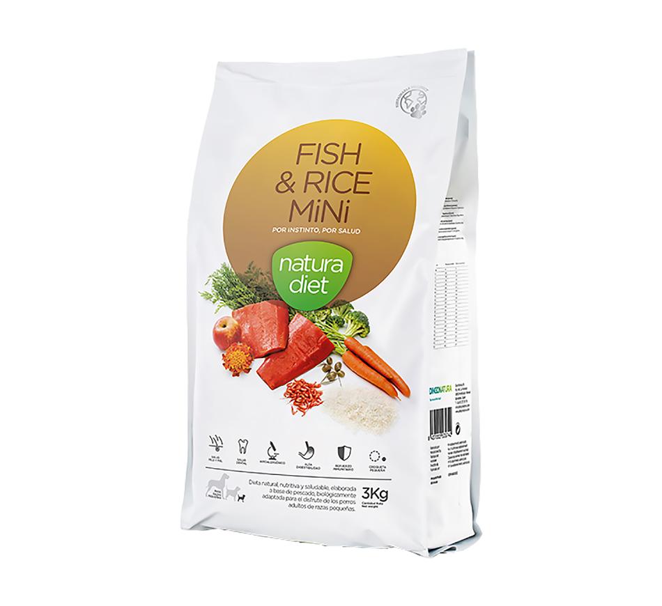 Natura Diet Cão Peixe & Arroz Mini é uma dieta natural, nutritiva e saudável, elaborada a base de peixe, biologicamente adaptada para cães adultos de qualquer raça e de tamanho pequeno. Fish & Rice Mini é altamente digerível, elaborada com ingredientes naturais com capacidade alergénica reduzida ou nula.