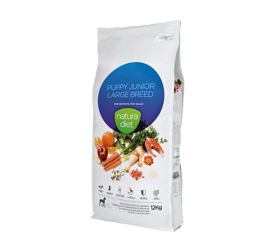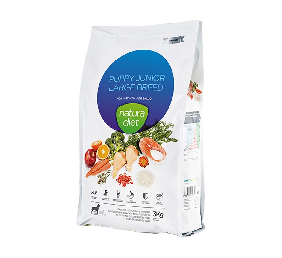 Natura Diet Cão Puppy & Junior Large Breed é um alimento 100% natural, livre de transgénicos (GMO FREE), sem Glúten e rica em Ómega 3 e 6, contém ingredientes especialmente selecionados de fácil digestão para favorecer uma transição mais gradual da alimentação líquida à alimentação sólida em cachorros. É um produto formulado por veterinários especialistas em nutrição animal.