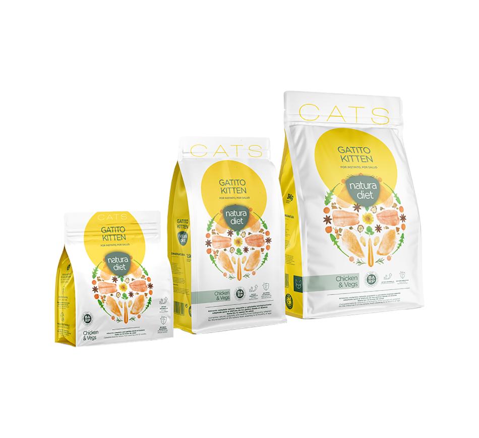 Natura Diet Kitten Frango e vegetais é um alimento completo para gatinhos, natural, nutritivo e saudável para que o seu gatinho possa disfrutar. Por ser biologicamente adaptado pode ser desfrutado por gatos bebés, desde o desmame, até aos 12 meses de idade. A seleção especial de ingredientes reforça o seu sistema imunitário, favorecendo um desenvolvimento saudável e um crescimento ótimo.