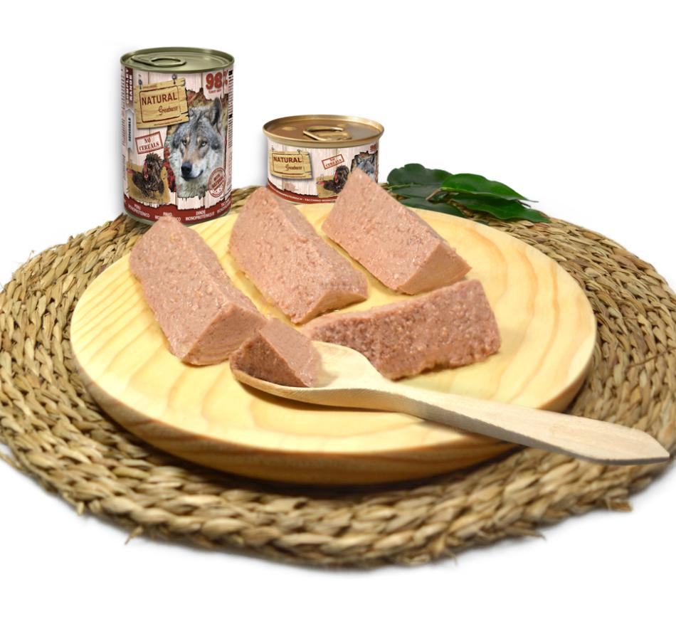 Todas as nossas receitas de comida húmida completa e complementar para cães são feitas com os mais altos padrões de qualidade, tanto na sua preparação como na sua apresentação final, usando carnes de alta qualidade, como frango, peru, cordeiro ou salmão, e outras carnes menos comuns, como bacalhau, carne Angus ou canguru, um deleite para os paladares dos cães mais exigentes.
